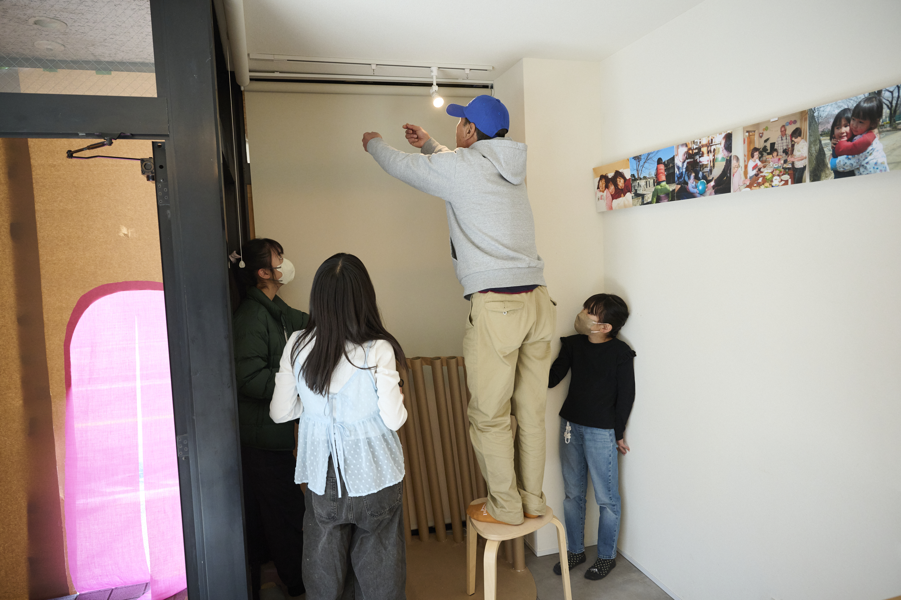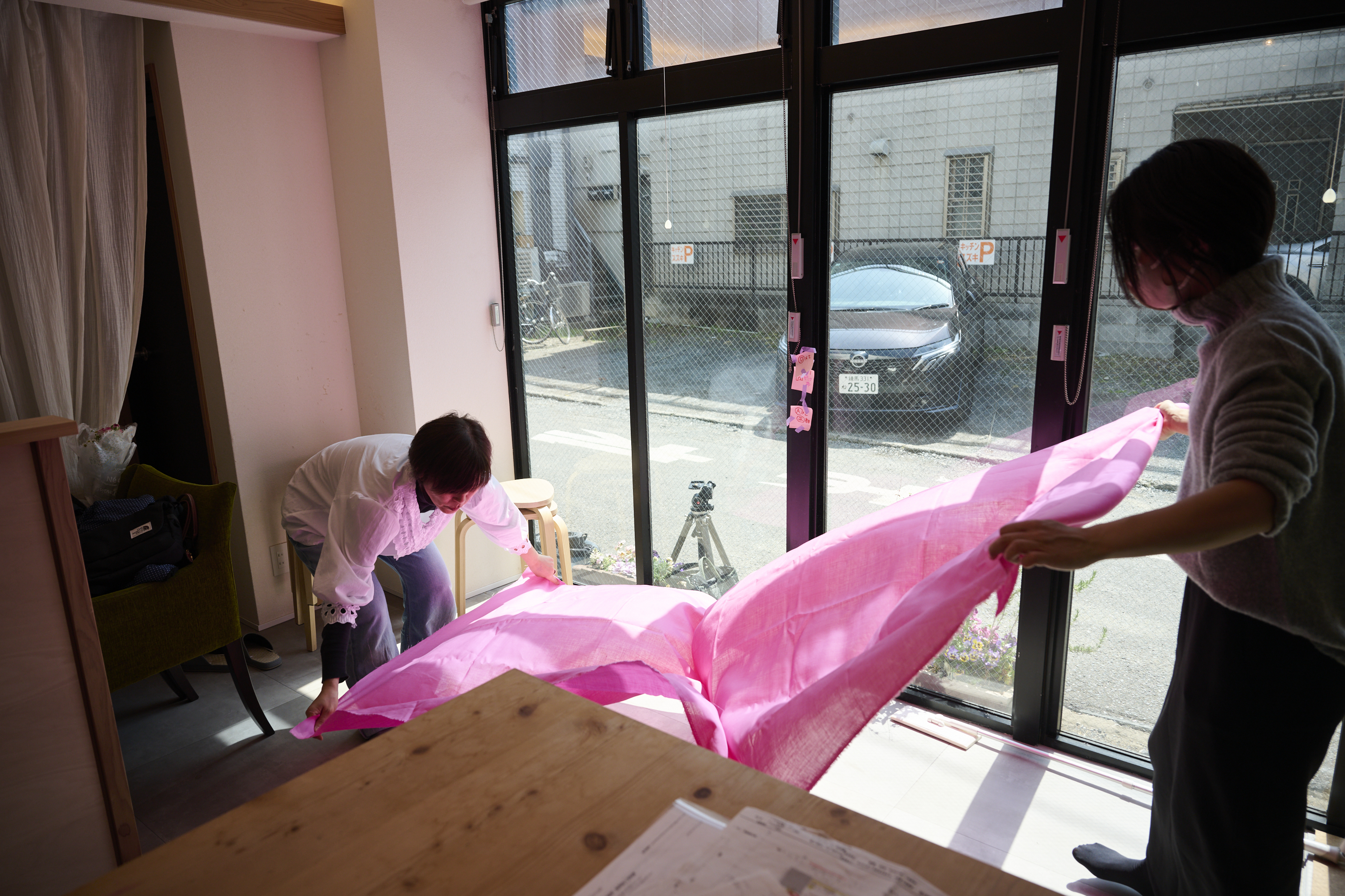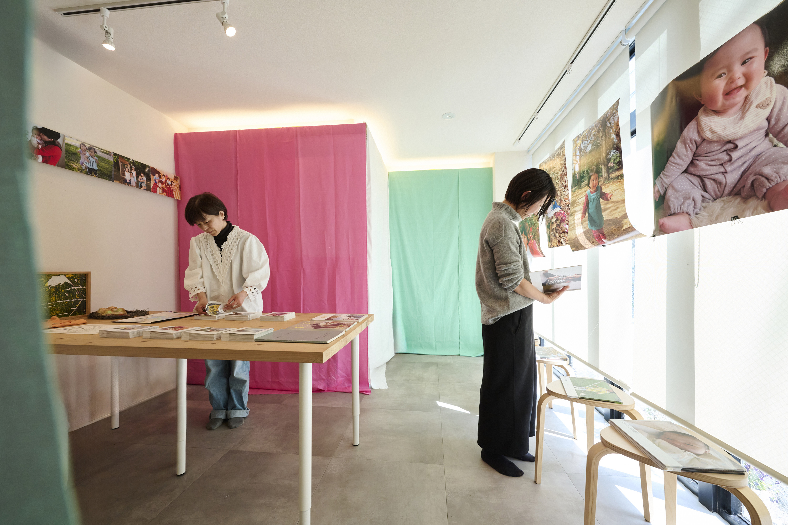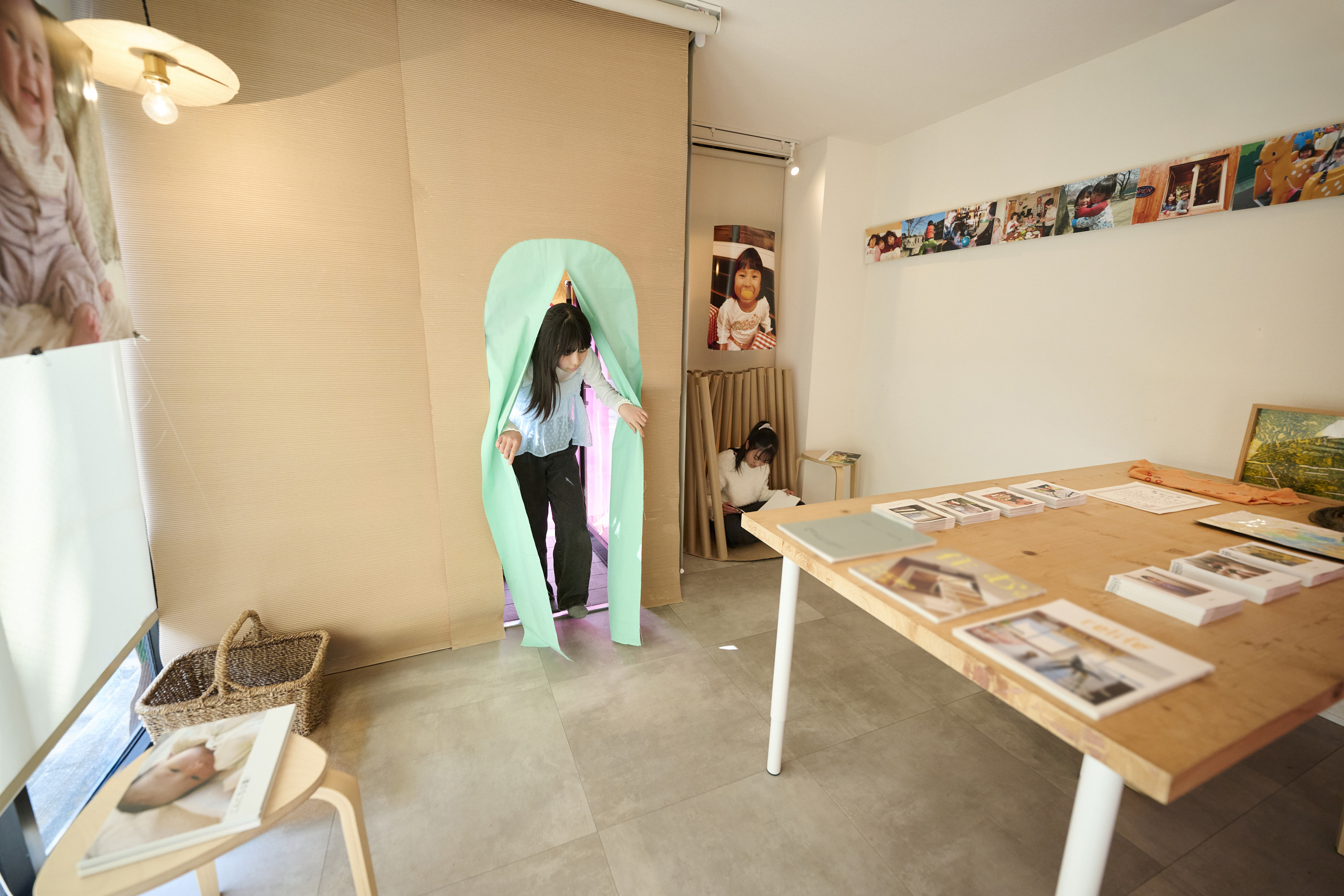 また子どもたちが主なゲストということもあり、カラフルで楽しい空間になるよう意識した。個人的なテーマカラーでもあるフューシャピンクとミントグリーンの肌触りの良い麻布を使用することで住宅設計では手がけたことのない、大胆な配色の演出を今回試みた。麻布は、今後自邸で再利用する予定です。